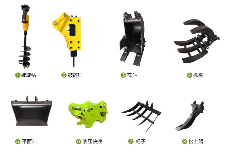 1.8T挖掘機(jī)還可以搭配螺旋鉆、抓夾、耙子、松土器、窄斗等屬具使用,滿足不同的施工場合。