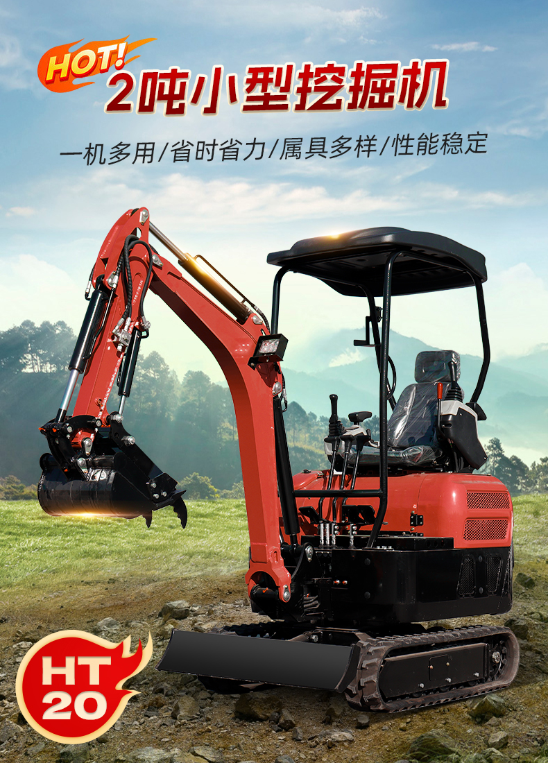 復雜工況(如山地開荒、破碎作業 ):對動力和屬具兼容性要求高。海拓 HT18 挖掘機,配備品牌發動機,動力強勁,支持 30 + 種屬具(如破碎錘、松土器 ),應對破碎、挖掘、抓舉等多場景作業;HT20 作為 2 噸級機型,大臂油缸倒立設計增加挖掘深度,屬具多樣,也適配復雜工況。
