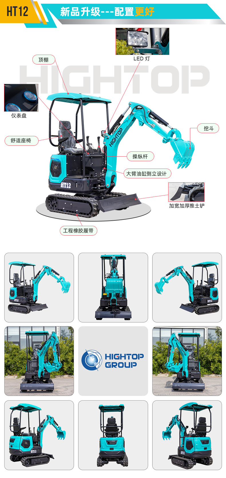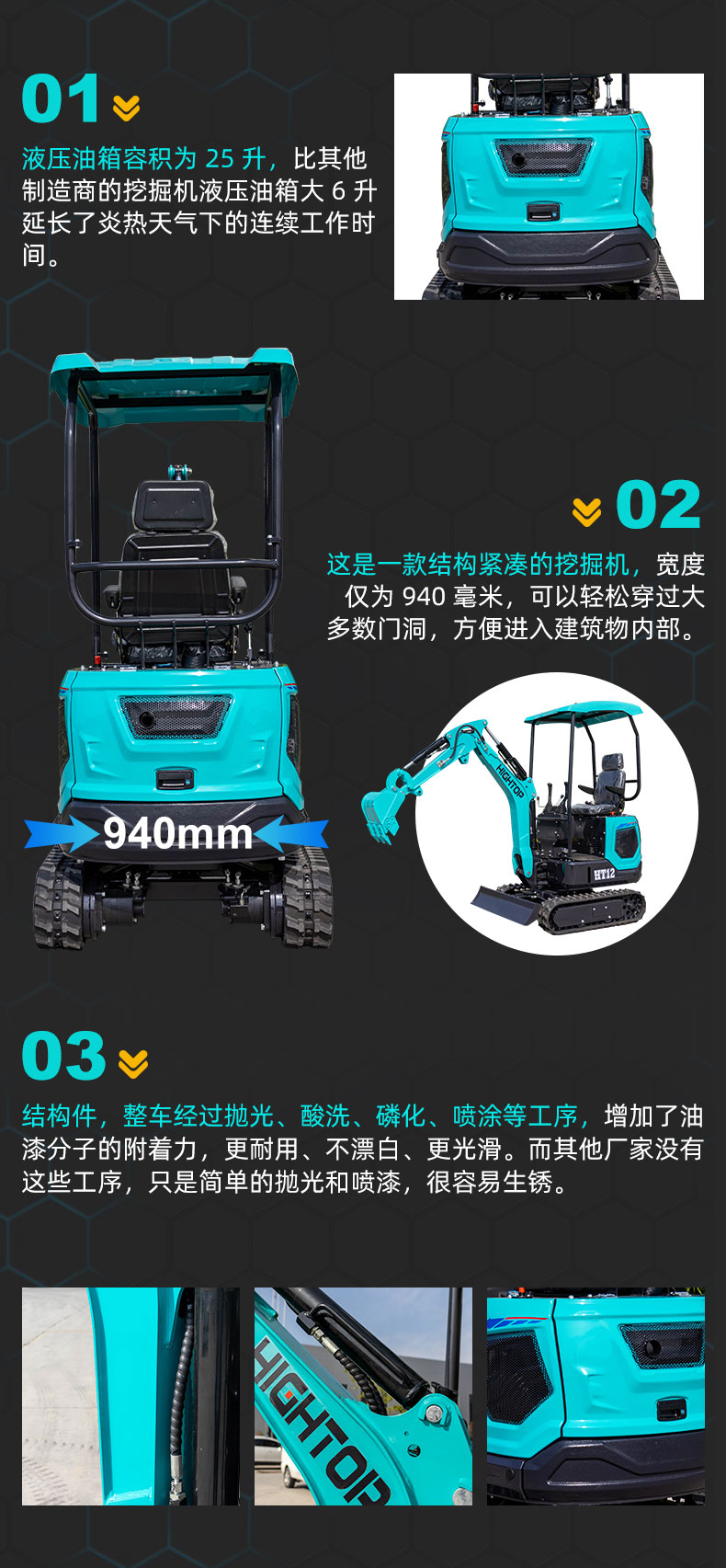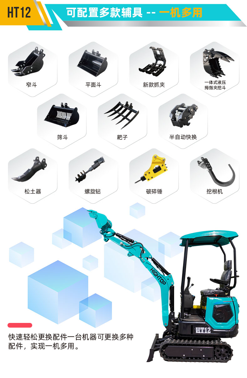 HT12 1200kg 小型挖掘機液壓油箱容積為 25L,比其他制造商的挖掘機液壓油箱大 6 升,延長了炎熱天氣下的連續工作時間。