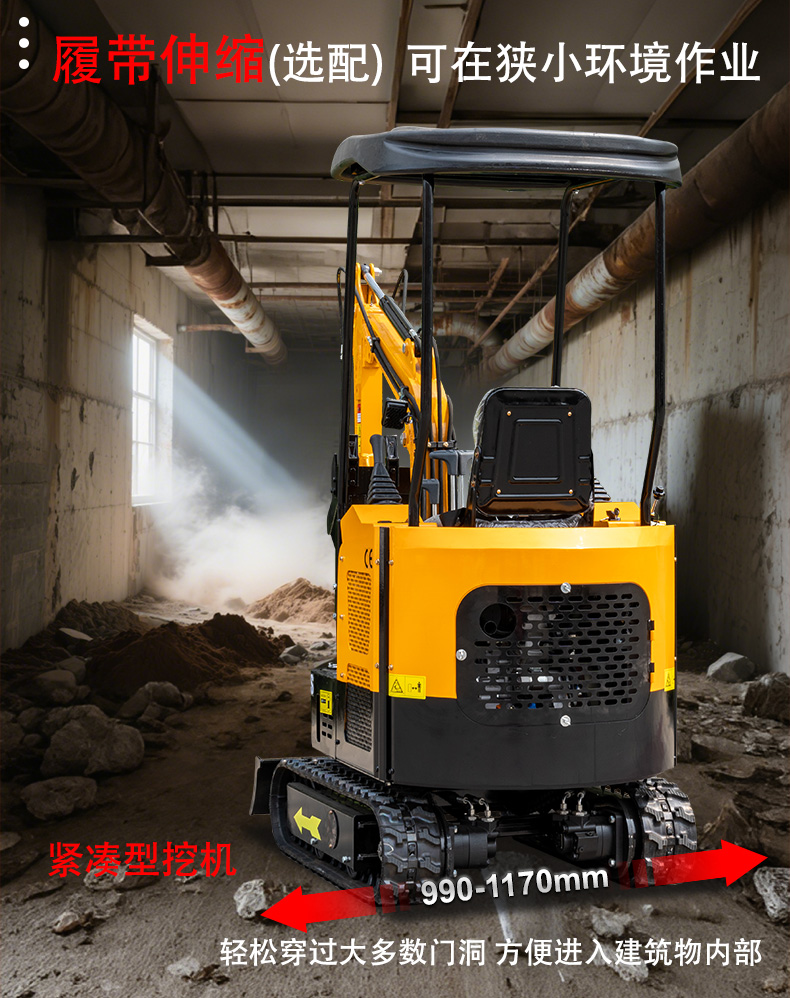 在整機尺寸方面,它運輸長度僅 2270mm,總寬度 1000mm,上部寬度 940mm,總高度(駕駛室頂)2290mm,這樣緊湊的身形使其能輕松穿梭于狹窄場地。標準履帶板寬度 180mm,軌距 820mm,履帶接地長度 890mm,履帶長度 1235mm,配合 30 度的爬坡能力,確保在多種地形都能穩定行駛。推土鏟離地高度 95mm,推挖掘深度 220mm,尾部回轉半徑 870mm,進一步提升了其在受限空間內的操作靈活性。
